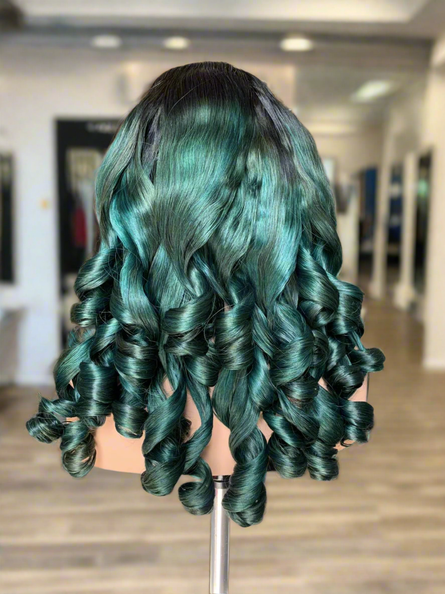 Introducing Jaida, a show-stopping emerald green balayage lace front wig made from hand-colored, 100% single-donor human hair. This luxe unit features a deep black root melt that seamlessly transitions into a rich jewel-toned emerald green, offering a bold yet sophisticated look with natural movement and luster.