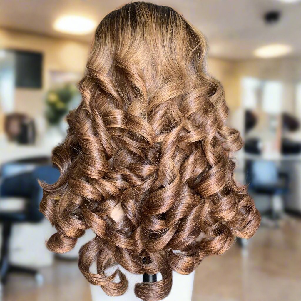Lola is a show-stopping, voluminous curly unit with caramel balayage highlights. Designed with a luxurious density, this wig gives a stunning contrast of dark roots with golden highlights for a multi-dimensional effect. The HD lace blends effortlessly for a natural look.